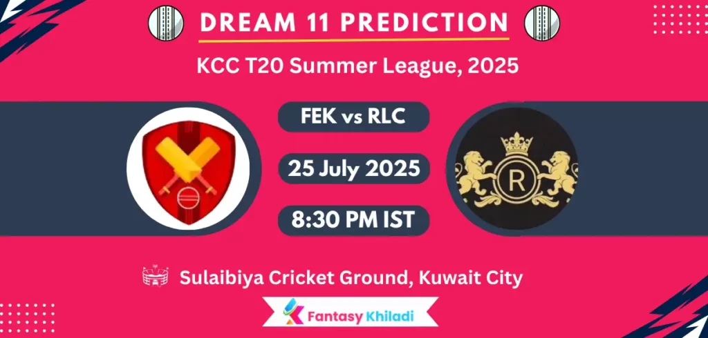 FEK vs RLC Match 26th, Dream11 Prediction Today Match Preview: In a Group-2 clash, Fakhr-E-Kashmir will take on Royal Lions CC at Sulaibiya Cricket Ground, Kuwait City on July 25, starting at 8:30 PM IST.