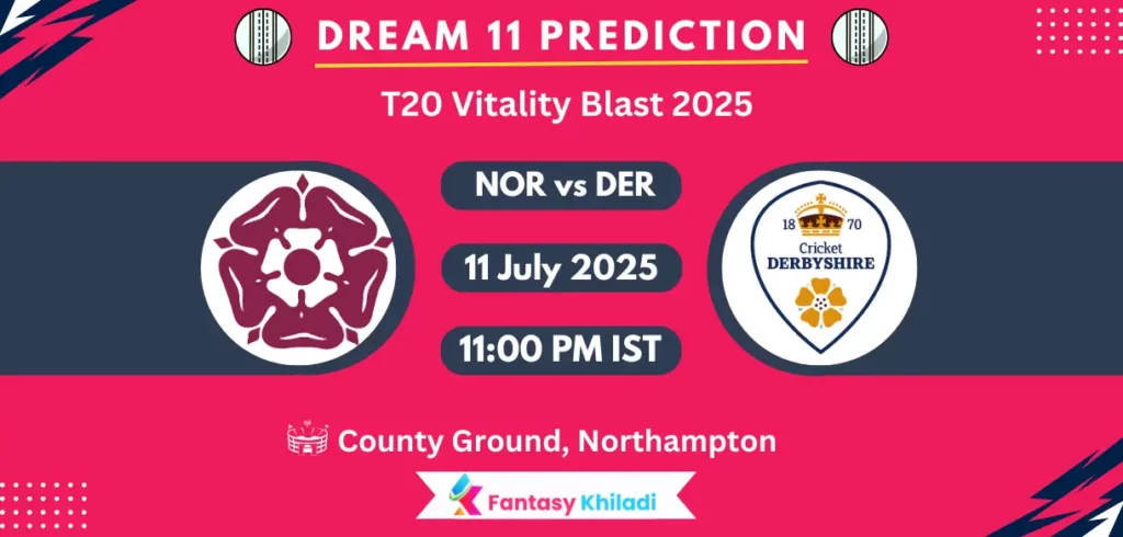NOR vs DER Match 100th Dream11 Team Prediction Today Match Preview: The ongoing tournament “T20 Vitality Blast 2025” brings the 100th match as Northamptonshire takes on Derbyshire at County Ground, Northampton on July 11, starting at 11 PM IST. Get ready for this North Group clash as the match starts soon.
