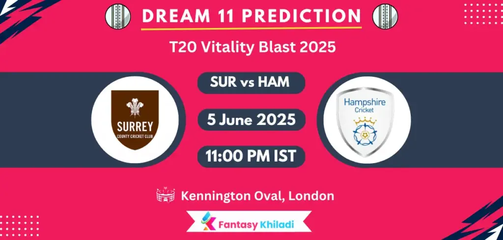SUR vs HAM Match 21th Dream11 Team Prediction Today Match Preview: Running in full swing, the T20 Vitality Blast 2025 will see Surrey (SUR) taking on Hampshire (HAM) at Kennington Oval, London in Match No. 21 on June 5, starting at 11 PM IST. In the South Group, this match brings both teams to make a statement as they have picked up momentum.
